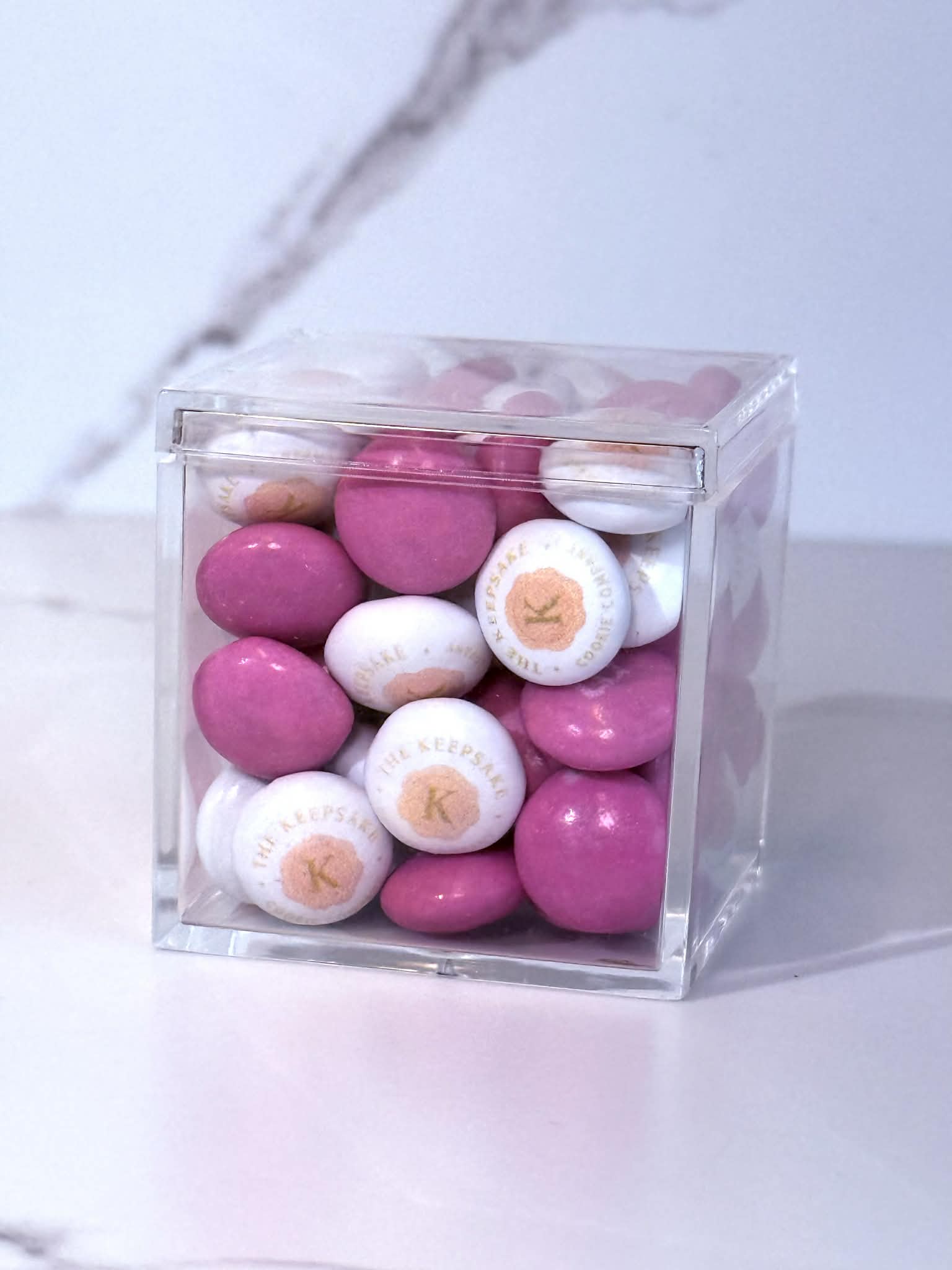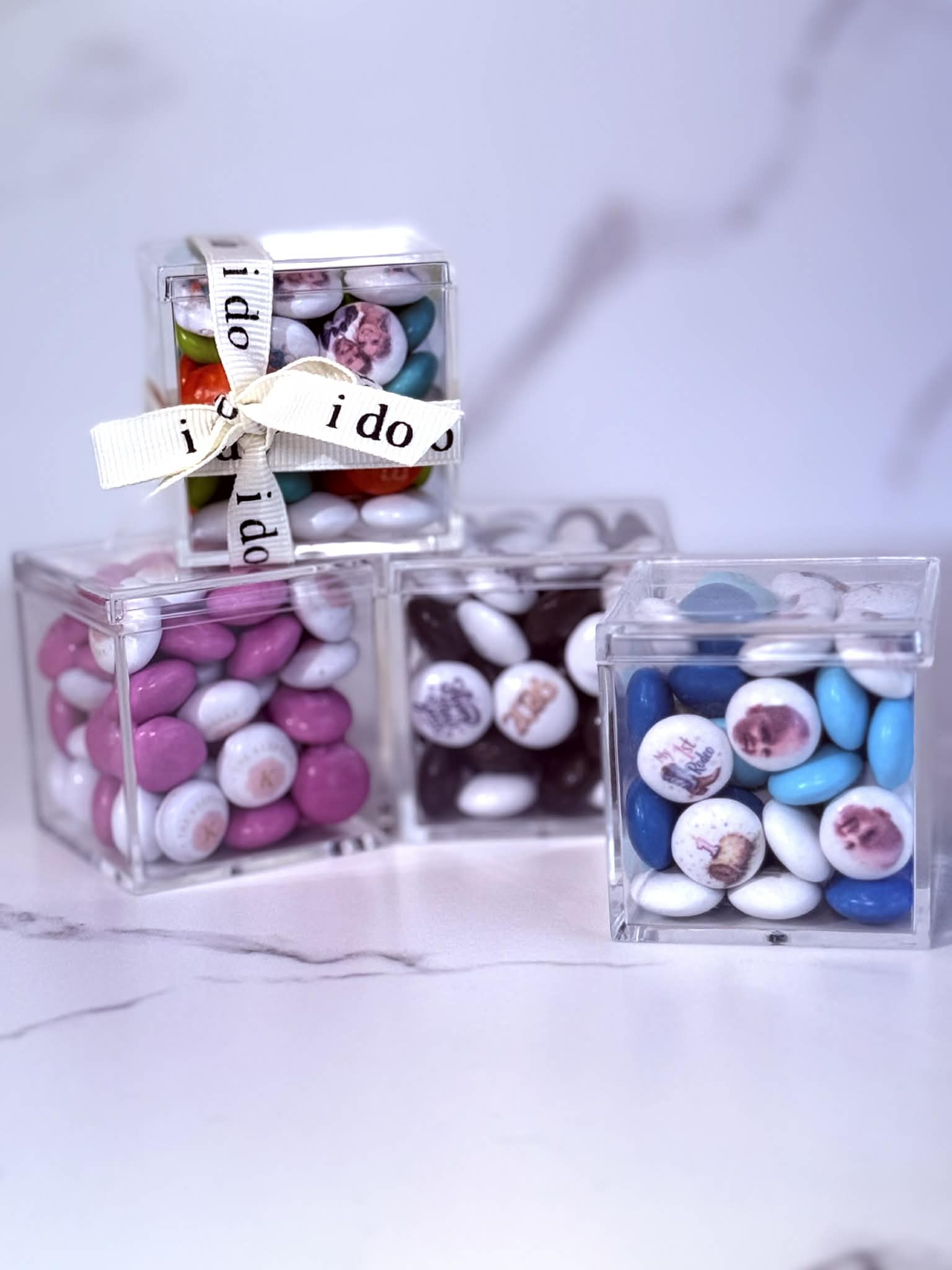 The Keepsake Curio Box™ is a curated collection of four crystal-clear acrylic cubes, each filled with approximately 66 handcrafted Keepsake M&Ms™ thoughtfully designed, custom printed, and beautifully arranged for a polished, cohesive presentation.