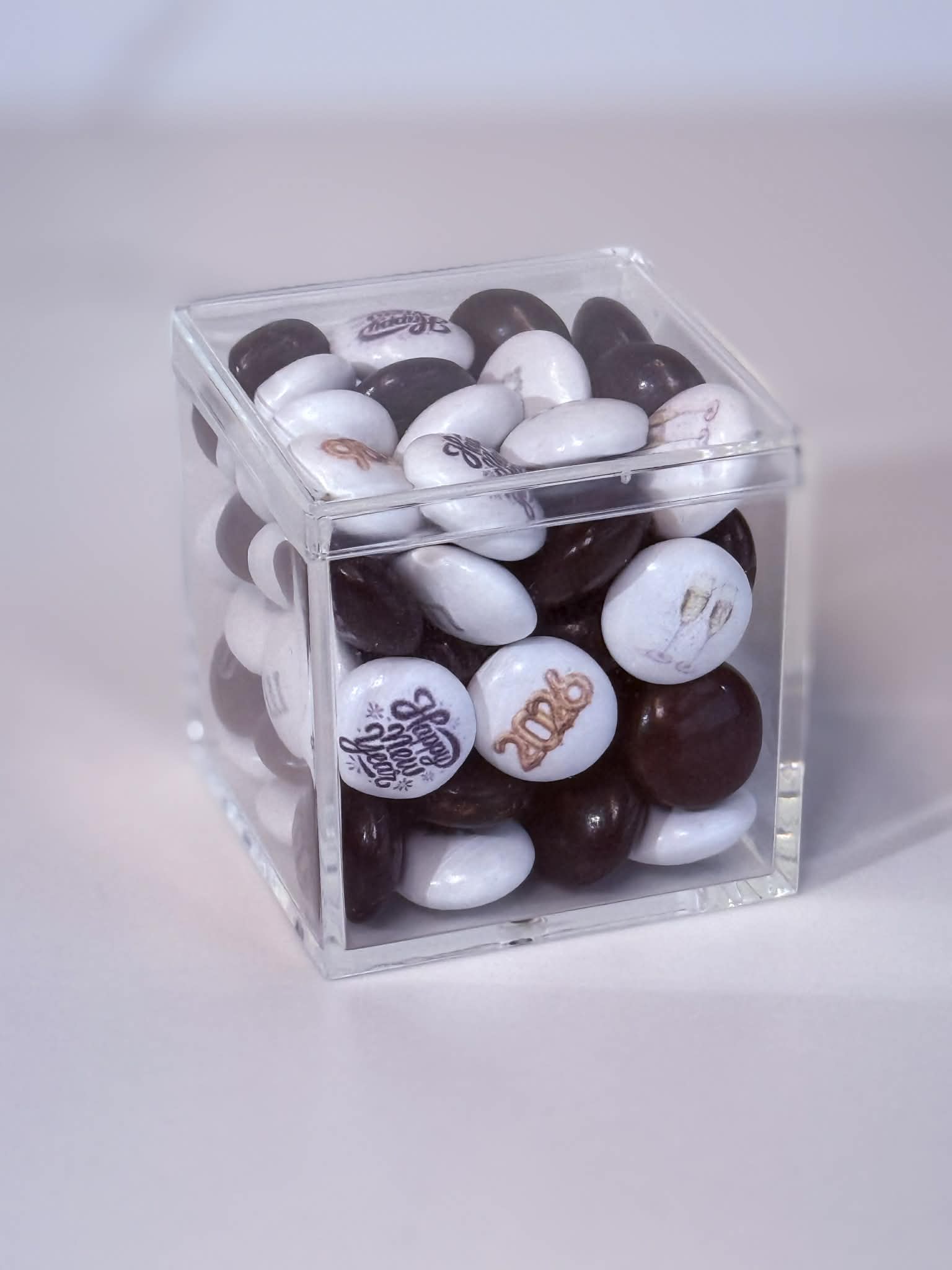 Each confection is made-to-order and personalized with your choice of full-color photos, text, or custom graphics applied consistently across the set for an elevated and refined finish. Approximately half of the M&Ms™ in each cube are custom printed, complemented by a coordinating solid filler color for balance and sophistication.